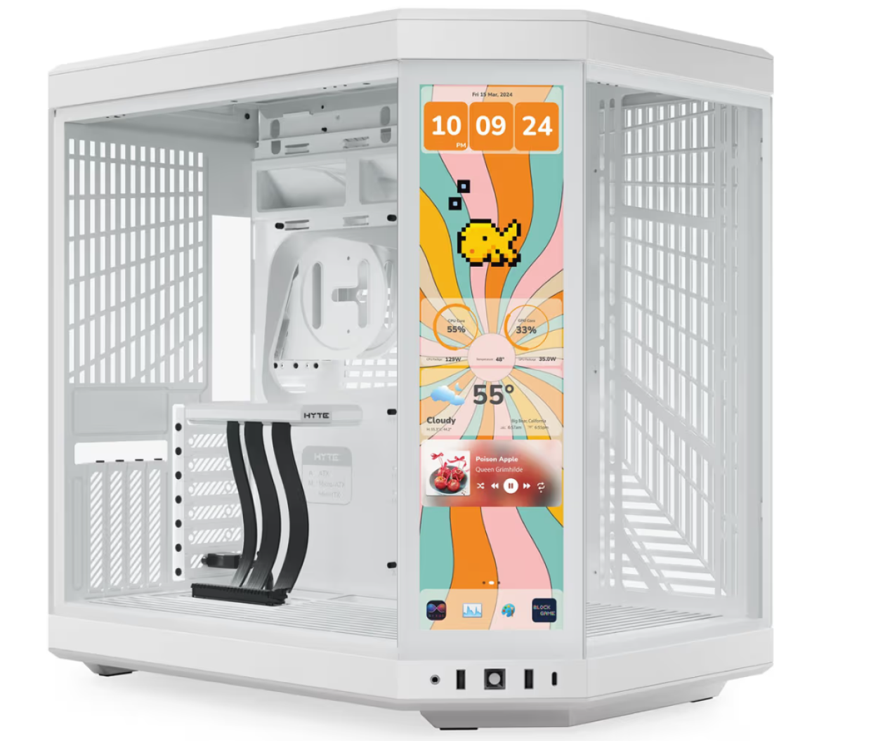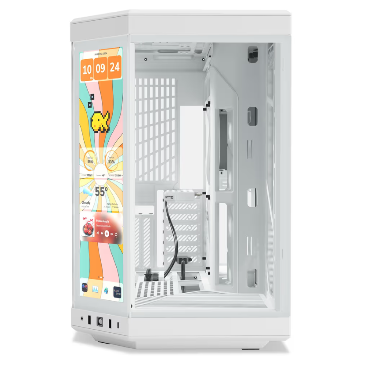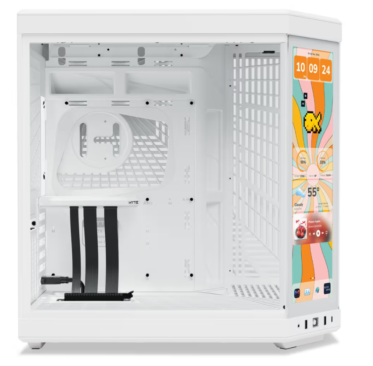 Deze uitvoering van de Hyte Y70 Touch is voorzien van een aanraak IPS LCD scherm in het middelste verticale glaspaneel. Hierop kun je hardware informatie en/of bewegende beelden te laten zien. Hyte heeft speciale software ontwikkeld waarmee je van alles aan harware informatie, het weer, coole afbeeldingen of zelf basic games kunt spelen.
